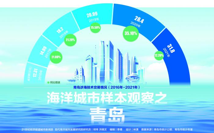 梳理青岛海洋产业发展数据可以发现,2021年青岛全市完成海洋生产总值4684.84亿元,总量居全国沿海同类城市第一位,占GDP比重达30%以上。其中,2016年至2021年,青岛涉海技术交易合同成交额由12.31亿元翻倍增长至31.80亿元,每年增速均超两位数。
