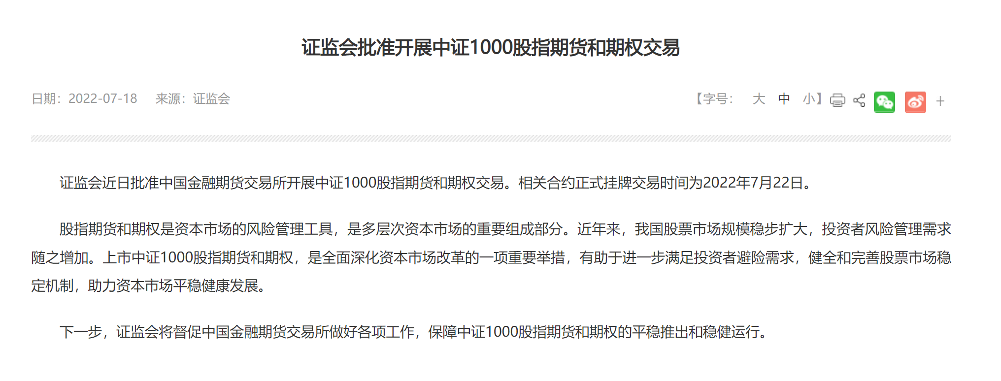 7月18日,证监会官网消息显示,证监会近日批准中国金融期货交易所开展中证1000股指期货和期权交易。相关合约正式挂牌交易时间为2022年7月22日。