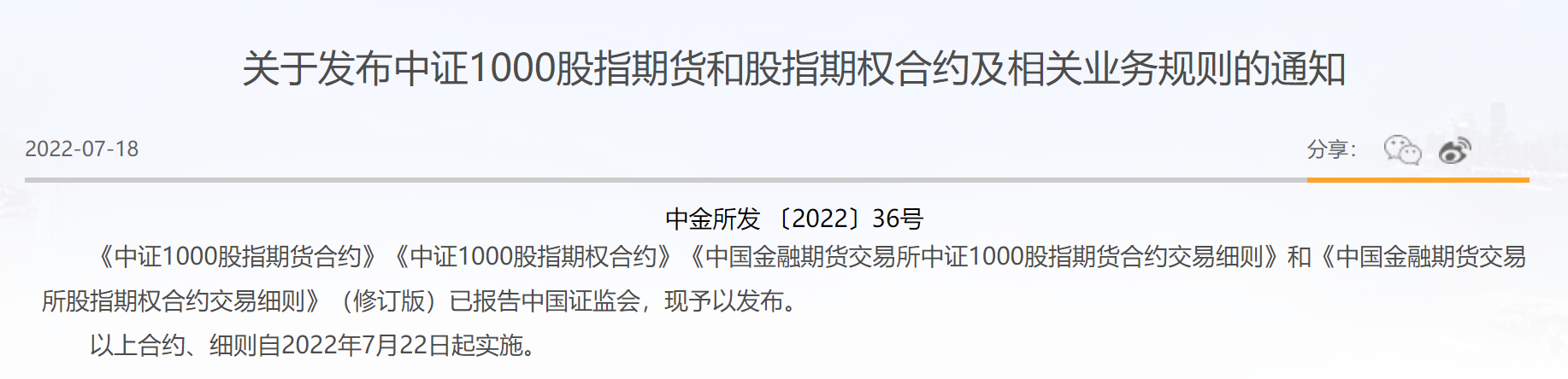 在证监会发布公告表示批准开展中证1000股指期货和期权交易后,中金所第一时间发布了关于发布中证1000股指期货和股指期权合约及相关业务规则的通知。
