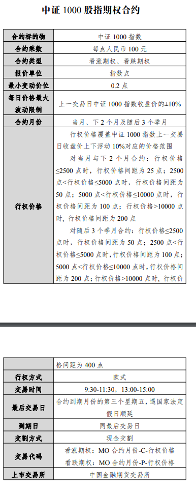 最后交易日为合约到期月份的第三个星期五,遇国家法定假日顺延。到期日同最后交易日。交割方式为现金交割。中证1000股指期权合约看涨期权交易代码为MO合约月份-C-行权价格,看跌期权交易代码为MO合约月份-P-行权价格。