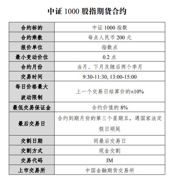 涨跌停板幅度为上一交易日结算价的±10%,到期月份合约最后交易日涨跌停板幅度为上一交易日结算价的±20%。最低交易保证金标准设计为合约价值的8%。最后交易日为合约到期月份的第三个星期五,遇国家法定假日顺延。最后交易日即为交割日。交割方式为现金交割。中证1000股指期货的合约交易代码为IM。