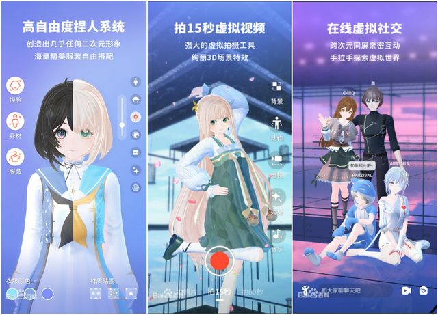 在波粒子推出的首款虚拟社交软件“Vyou微你”中,用户可以通过3D捏脸换装功能,创建自己的虚拟形象,通过手机前置摄像头及麦克风捕捉面部表情及声音,并与虚拟世界中的好友进行合影等社交互动。