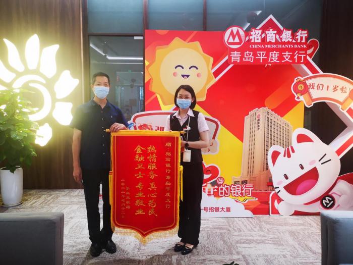 7月12日下午,刘奶奶的儿子李先生冒着雨来到招商银行青岛平度支行,对网点工作人员表示感谢,送上锦旗“热情服务 真心为民 金融卫士 专业敬业”。