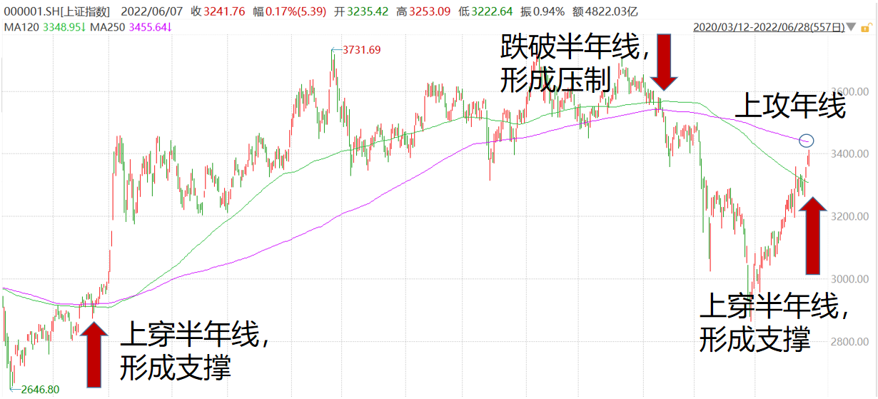 半年线一般被视为市场强弱(行情“好坏”)分界线之一,它对相关指数有一定的压制或支撑作用。