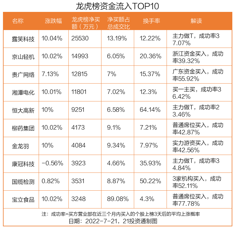7月21日,上证指数下跌0.99%,深证成指下跌0.94%,创业板指下跌0.5%。盘后龙虎榜数据显示,共有46只个股因当日异动登上龙虎榜,资金净流入最多的是露笑科技(002617.SZ),达2.55亿元。