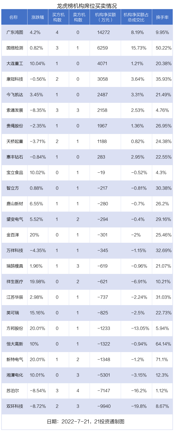 7月21日,25只个股龙虎榜出现了机构的身影,机构合计净买入5194.02万元。具体来看,机构净买入9股,净卖出16股。