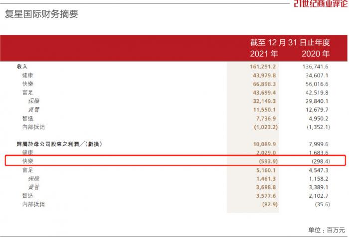 受疫情影响,世纪佳缘所在的复星国际大快乐板块大受打击。2020年,该板块亏损2.98亿元,去年亏损扩大到了5.94亿元。