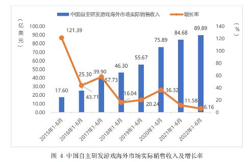 2022年上半年,我国自主研发游戏海外市场继续扩大,近年海外市场销售收入增速持续高于国内销售收入增速。2022年1-6月,中国自主研发游戏在海外的实际销售收入达 89.89 亿美元,同比增长 6.16%,但增长率有所下降。
