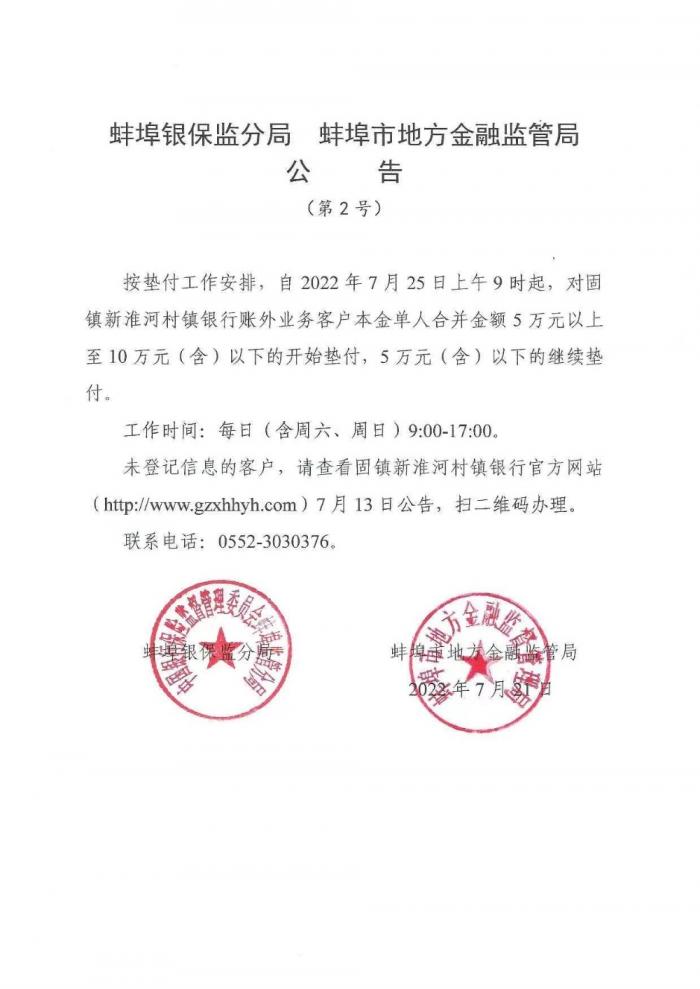 同日,安徽省蚌埠银保监分局 蚌埠市地方金融监管局发布公告表示:按垫付工作安排,自2022年7月25日上午9时起,对固镇新淮河村镇银行账外业务客户本金单人合并金额5万元以上至10万元(含)以下的开始垫付,5万元(含)以下的继续垫付。