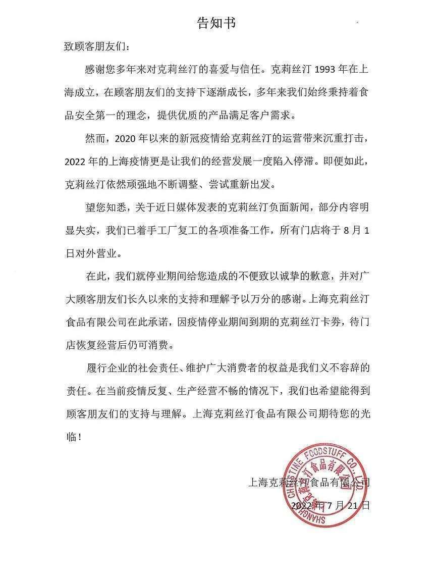 针对上述报道,今日下午上海克里斯汀食品有限公司对外发出通知,称媒体发表的部分内容明显失实,克里斯汀已在着手工厂复工的各项准备工作,所有门店将于8月1日对外营业。