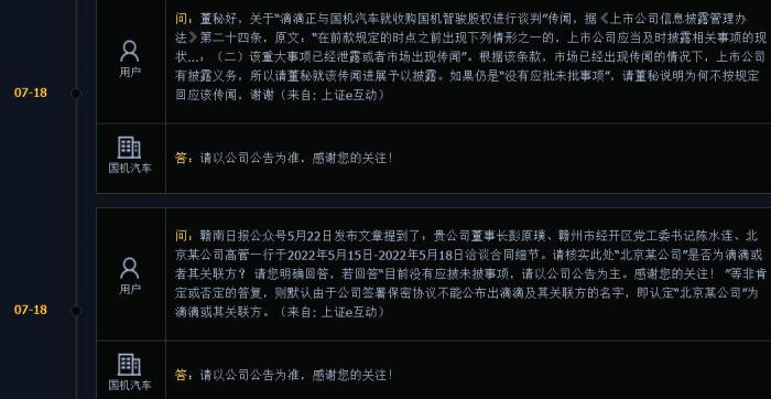 7月18日,一位投资者公开询问国机汽车:“赣南日报文章称,贵公司董事长彭原璞、赣州市经开区党工委书记陈水连和北京某公司高管一行于5月15日-18日洽谈合同细节。请问此处“北京某公司”是否为滴滴或者其关联方?”