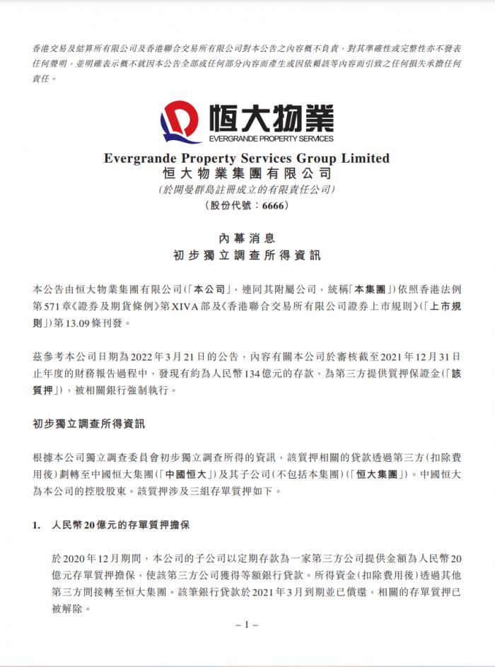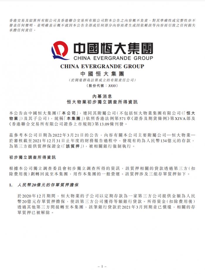 2022年7月22日晚间,中国恒大、恒大物业共同公告对此前恒大物业134亿元存款质押被相关银行强制执行事项的初步调查结果。