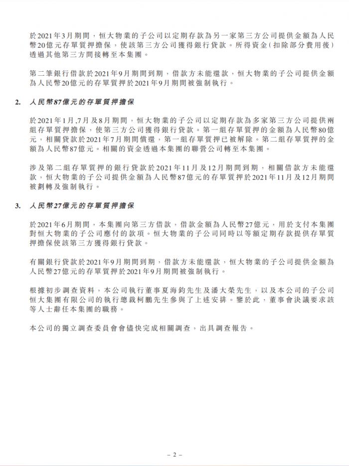 中国恒大在公告中称,根据独立调查委员会初步调查结果,恒大物业质押相关的贷款通过第三方(扣除费用后)回流至中国恒大,用作其一般营运。中国恒大在公告中披露了质押所涉三组存单的基本情况。