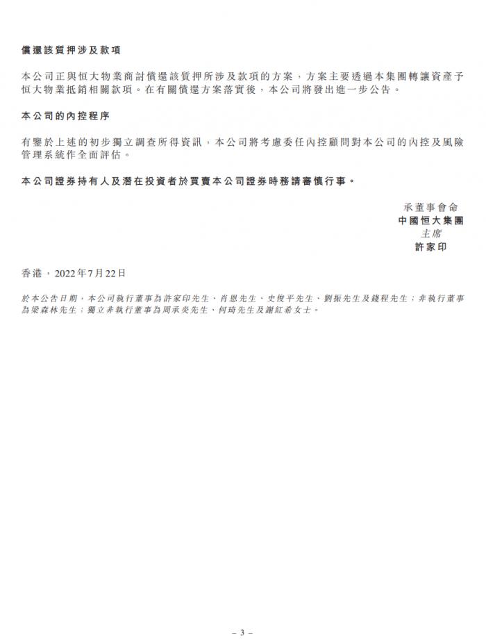 中国恒大在公告中表示,其正与恒大物业商讨偿还上述质押所涉及款项的方案,主要透过转让资产予恒大物业抵消相关款项等。在有关偿还方案落实后,中国恒大会发出进一步公告。