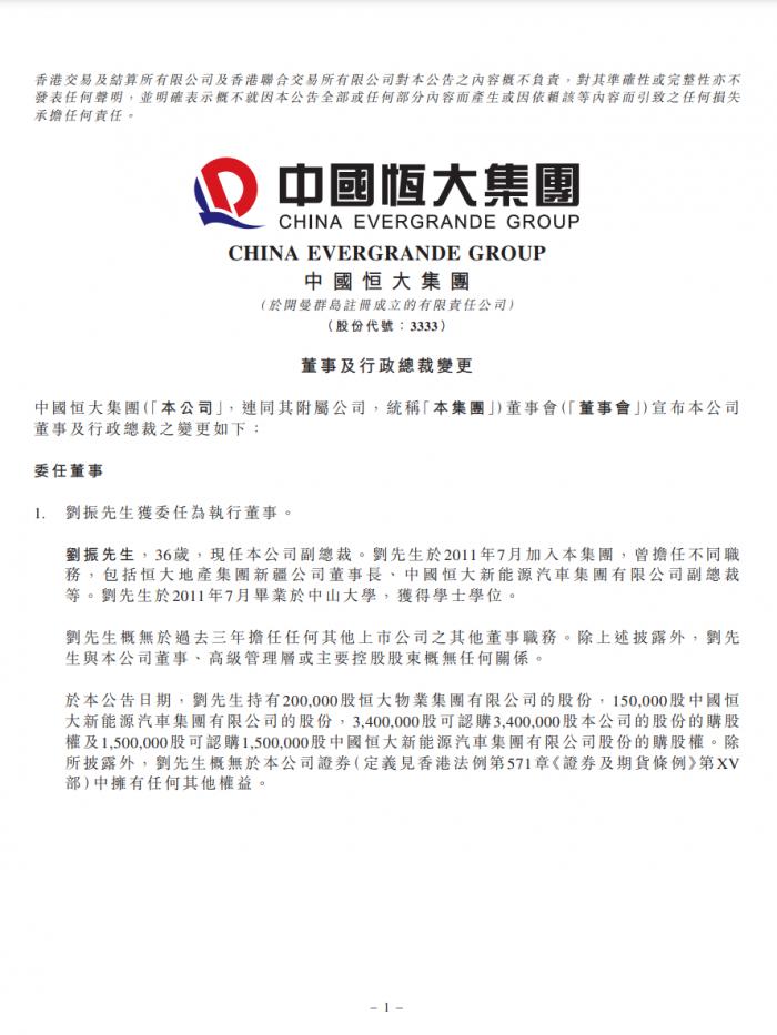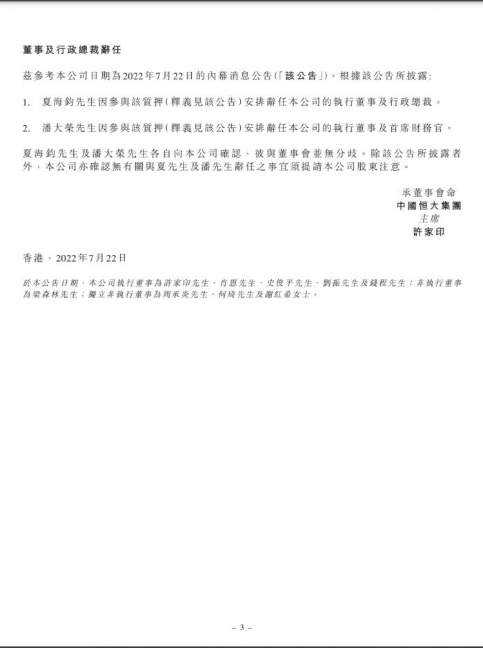 中国恒大称,初步调查资料显示,其执行董事夏海钧及潘大荣,以及子公司恒大集团有限公司执行总裁柯鹏参与了上述安排,鉴于此,董事会决议要求上述人士辞任相关职务。中国恒大还宣布,委任刘振、钱程为执行董事。