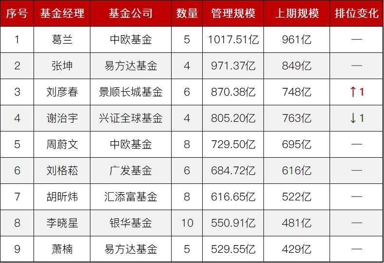 整体看这9位基金经理的管理规模都有所上升,排序上刘彦春超过了谢治宇。