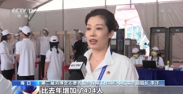 第二届消博会志愿者服务保障工作领导小组常务副组长 李洋:1250名青年志愿者覆盖了机场大厅、场馆周边和展区服务台,贯穿重要论坛、新品发布、媒体宣传等各类活动的始终,比去年增加了434人。