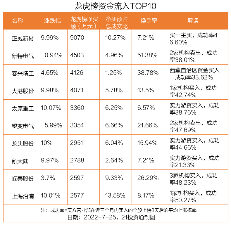 7月25日,上证指数下跌0.6%,深证成指下跌0.83%,创业板指下跌1.18%。盘后龙虎榜数据显示,共有44只个股因当日异动登上龙虎榜,资金净流入最多的是正威新材(002201.SZ),达0.91亿元。