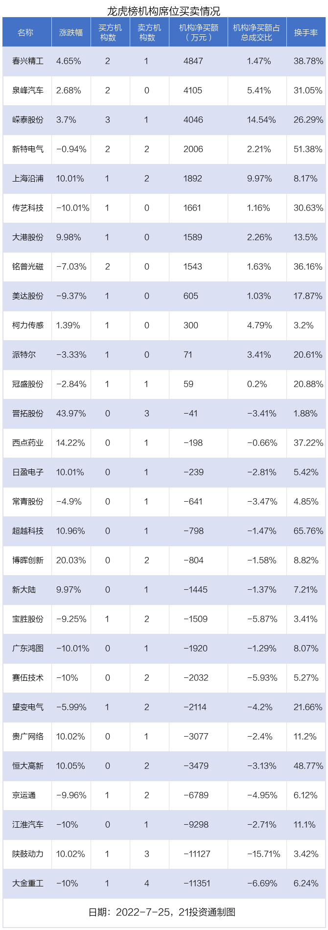 其中,机构净买入金额最多的是春兴精工(002547.SZ),当日收盘上涨4.65%,换手率为38.78%。