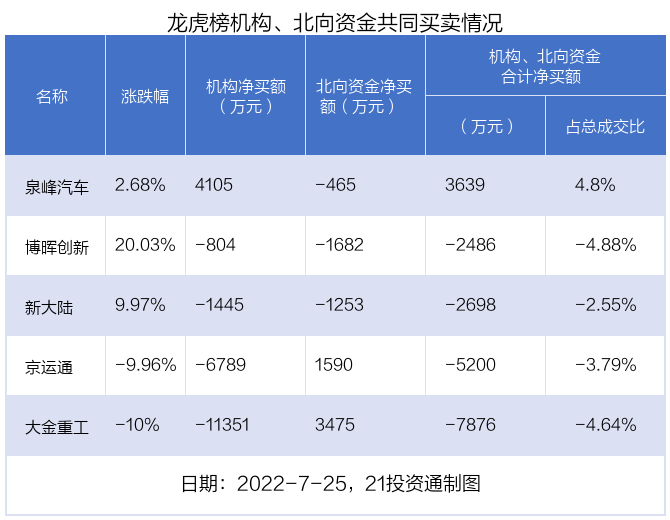 值得注意的是,机构和北向资金共同净卖出了新大陆、博晖创新等2股;在大金重工,京运通,泉峰汽车上出现分歧,机构净卖出大金重工1.14亿元,北向资金净买入3474.51万元;机构净卖出京运通6789.14万元,北向资金净买入1589.54万元;机构净买入泉峰汽车4104.82万元,北向资金净卖出465.44万元。