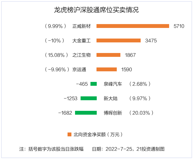 7月25日,北向资金参与龙虎榜中的个股共有7只,合计净买入9239.47万元。其中沪股通净买入2 股,净卖出1 股,合计净买入2990.65万元;深股通净买入2 股,净卖出2 股,合计净买入6248.82万元。