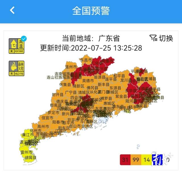 还没到中午,广东就已经被烤焦。截至13时25分,全省启动144个高温预警信号,其中有31个高温红色预警,主要在广佛两地、粤东和粤北。