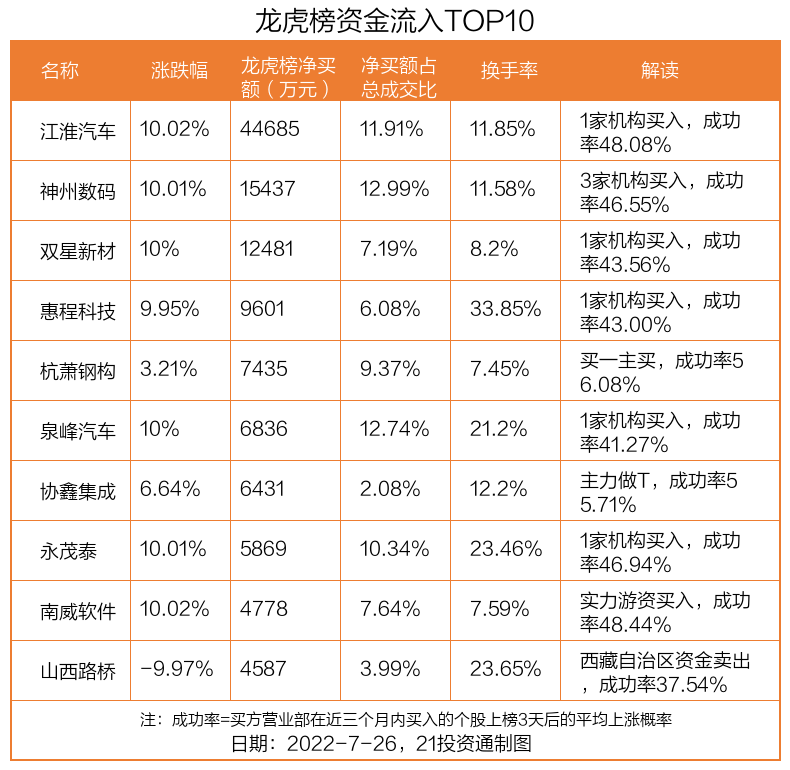 7月26日,上证指数上涨0.83%,深证成指上涨0.95%,创业板指上涨0.31%。盘后龙虎榜数据显示,共有37只个股因当日异动登上龙虎榜,资金净流入最多的是江淮汽车(600418.SH),达4.47亿元。