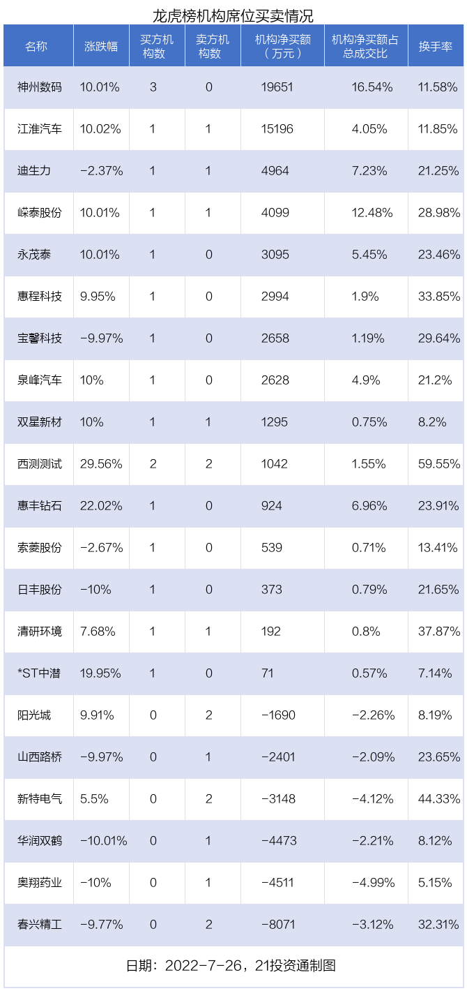 7月26日,21只个股龙虎榜出现了机构的身影,机构合计净买入3.54亿元。具体来看,机构净买入15股,净卖出6股。