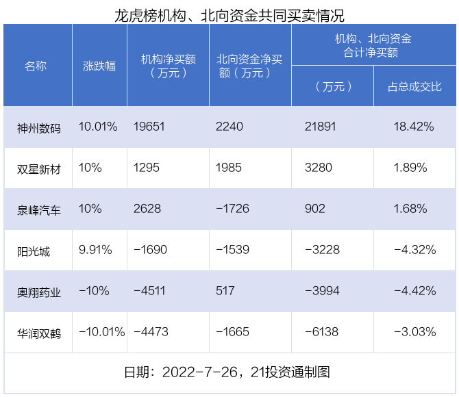 值得注意的是,机构和北向资金共同净买入了神州数码、双星新材2股;共同净卖出了阳光城、华润双鹤2股;在奥翔药业,泉峰汽车上出现分歧,机构净卖出奥翔药业4511.31万元,北向资金净买入517.45万元;机构净买入泉峰汽车2627.84万元,北向资金净卖出1725.98万元。