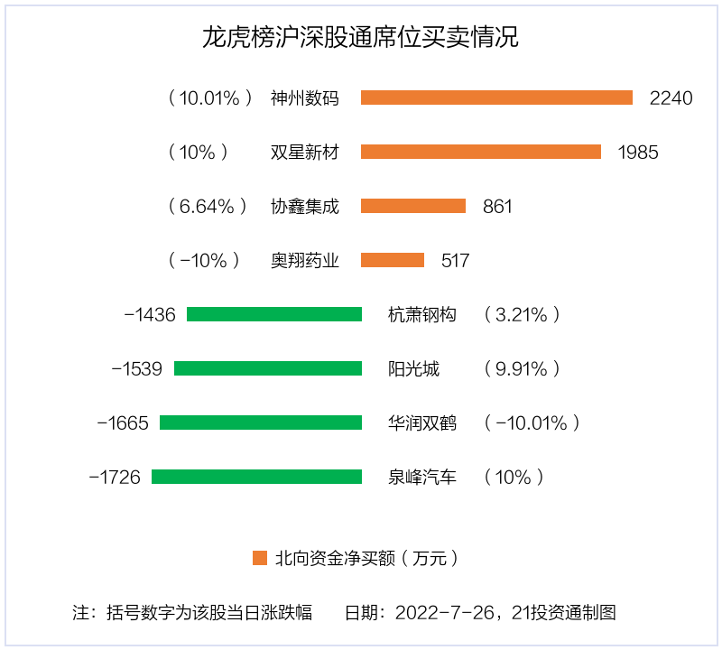 7月26日,北向资金参与龙虎榜中的个股共有8只,合计净卖出762万元。其中沪股通净买入1 股,净卖出3 股,合计净卖出4309.27万元;深股通净买入3 股,净卖出1 股,合计净买入3547.26万元。
