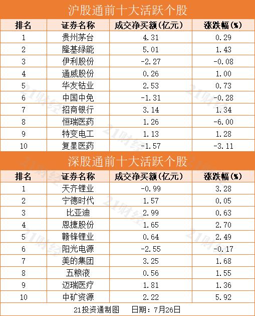 十大活跃个股方面,隆基绿能(601012.SH)获净买入居首,金额为5.01亿元。贵州茅台(600519.SH)、美的集团(000333.SZ)分别获净买入4.31亿元、3.25亿元。