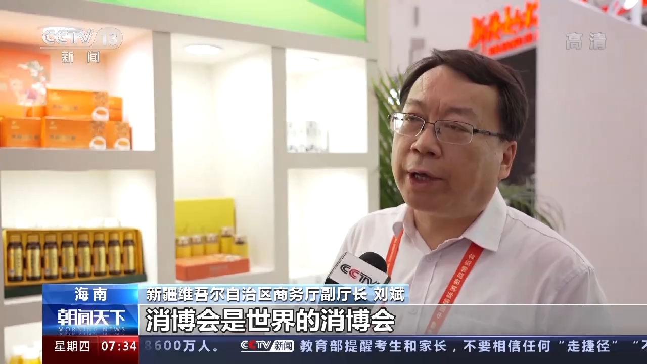 新疆维吾尔自治区商务厅副厅长 刘斌:消博会是世界的消博会,下一步我们将开发出更优更好的产品,来满足我们全国和世界的消费者。