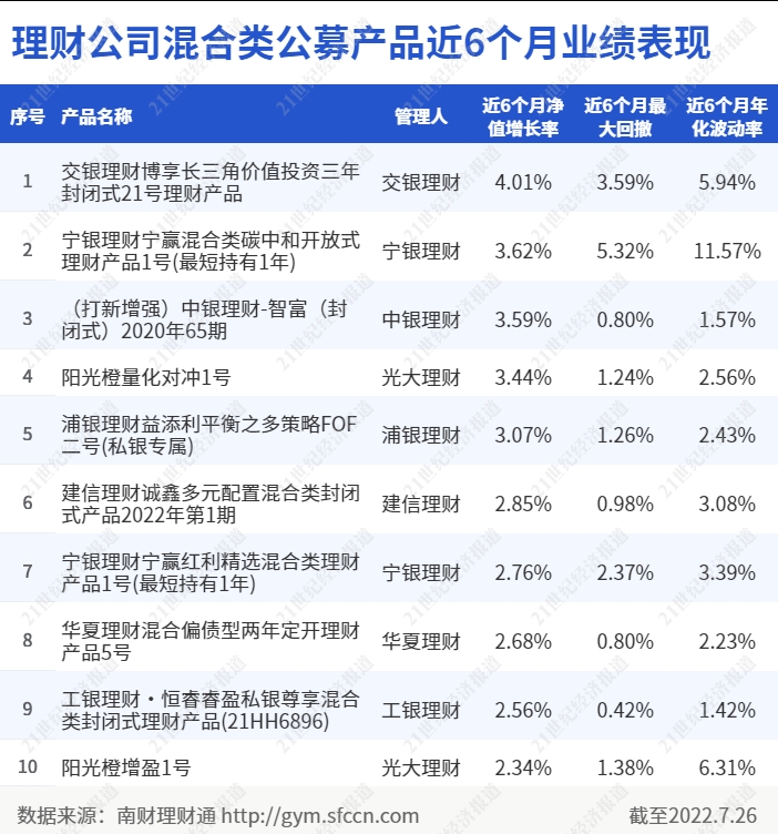 截至7月26日,在理财公司混合类公募产品近6月业绩榜单中,有8家理财公司的产品进入前10,分别是交银理财、宁银理财、中银理财、光大理财、浦银理财、建信理财、华夏理财和工银理财。其中,光大理财和宁银理财各有2只产品上榜,其余理财公司各上榜1只产品。