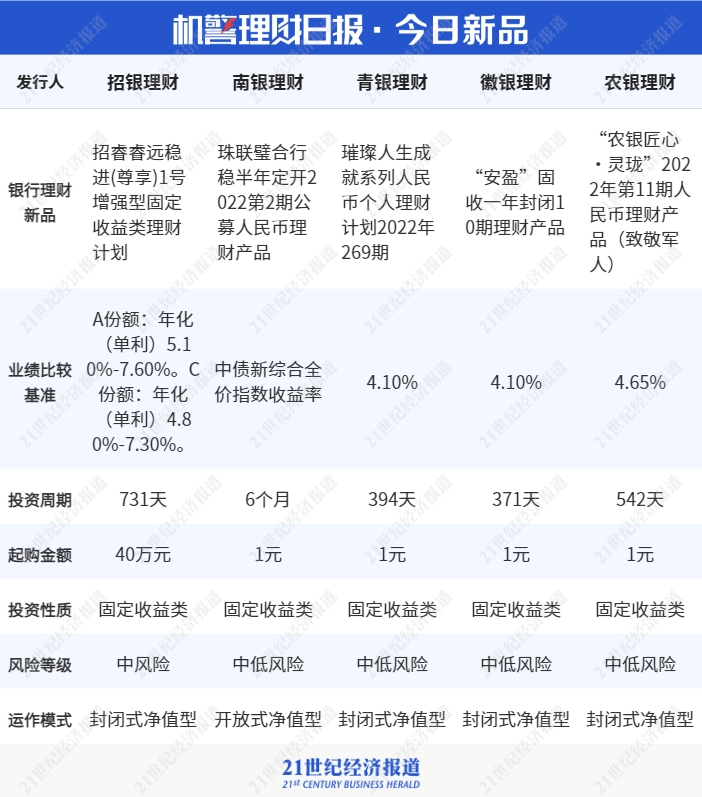 从收益表现看,排名前3的产品分别是交银理财“博享长三角价值投资三年封闭式21号”、宁银理财“宁赢混合类碳中和开放式理财产品1号(最短持有1年)”和“(打新增强)中银理财-智富(封闭式)2020年65期”,其近6个月收益率依次为4.01%、3.62%和3.59%。相比7月14日《机警理财日报》发布的同维度混合类公募产品榜单,前三甲产品收益率略有下滑。其中,“宁赢混合类碳中和开放式理财产品1号”产品近期波动较大,近6个月年化波动率达11.57%,近6个月最大回撤为5.32%,年化波动率与最大回撤均显著高于本期榜单中的其他产品。