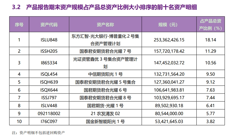 其中,7只私募基金分别是“国泰君安期货君合光耀7号”、“中信期货阳光1号”、“国泰君安期货君合光耀5号集合”、“国君期货君合光耀6号”、“国泰君安期货君合光耀8号”、“国君期货-光耀1号”和“国金新智能阳光1号”,合计占产品总资产的55.21%。