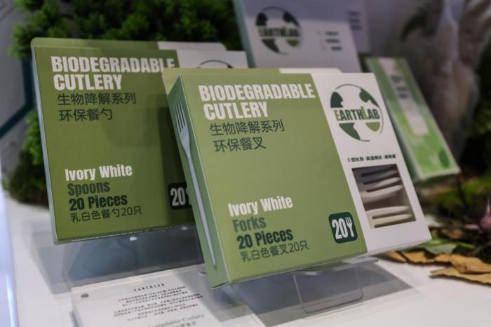 7月27日,这是在第二届消博会现场展出的生物降解系列餐具。新华社记者 张丽芸 摄