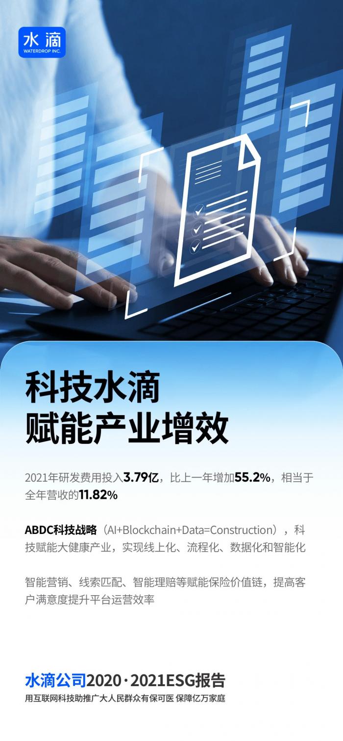 2020年,水滴公司提出“ABDC”科技战略(AI+Blockchain+Data=Construction)。在科技力量打造上,水滴公司注重技术在具体业务中的落地。使其更好地为用户提供服务、为运营效率加速,并通过外部输出能力,为产业的线上化、流程化、数据化和智能化提供助力。通过智能理赔系统,水滴保已实现线上申请理赔率100%,最快理赔时效为8秒,仅在2021年就减免理赔实物单据261万张。
