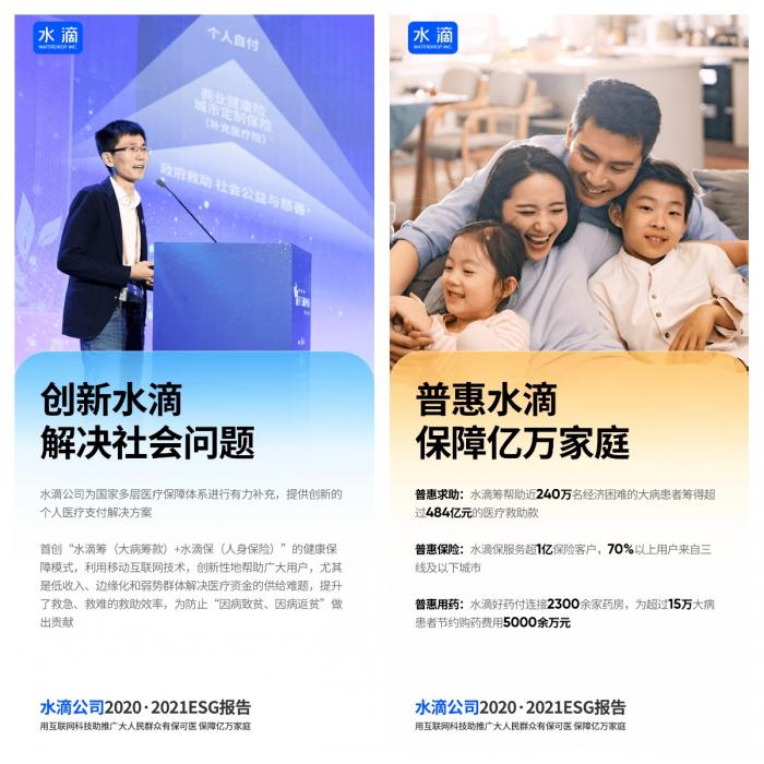 报告指出,近年来水滴公司通过首创的“水滴筹(大病筹款)+水滴保(人身保险)”的健康保障模式、医疗创新支付业务水滴好药付、联合浙江省缙云县医疗保障局推出的“缙情帮”医保防贫项目、参与十余个城市的惠民保项目等多元业务模式和项目,共同为国家多层次医疗保障体系进行有力补充。截至2021年底,水滴筹为近240万大病患者筹集484亿多医疗资金,水滴保累计服务保险客户数超过1亿多,水滴通过创新业务模式惠及过亿用户,在防止“因病致贫”“因病返贫”的工作中贡献力量。