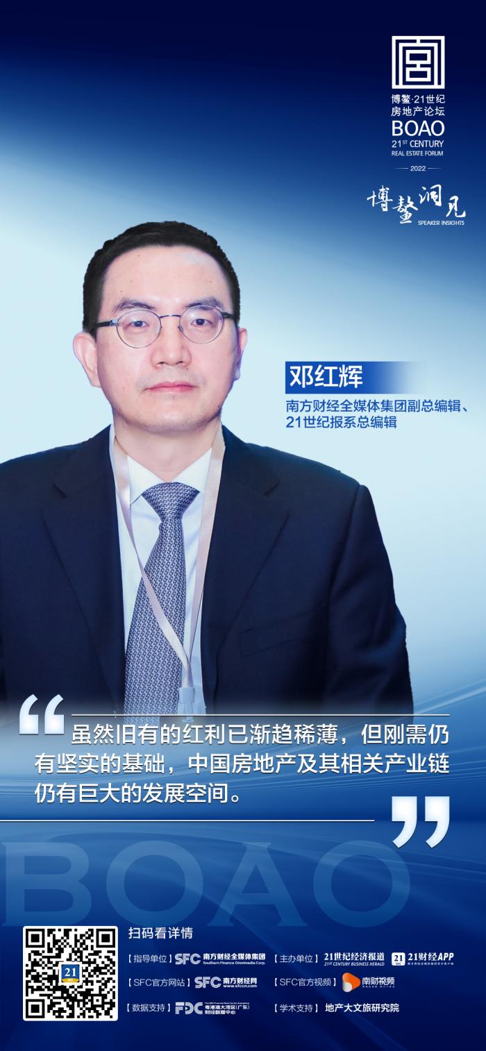 7月29日,“博鳌·21世纪房地产论坛第22届年会”召开,大会主题为“风雨蜕变:良性循环下的模式重构”。南方财经全媒体集团副总编辑、21世纪报系总编辑邓红辉在致辞中表示,2022年是加快构建新发展格局、全面深化改革开放的重要年份。国内外形势复杂多变,风险挑战明显增多,但我国经济长期向好的基本面并未改变。在新的发展阶段,房地产业被赋予新的历史使命。