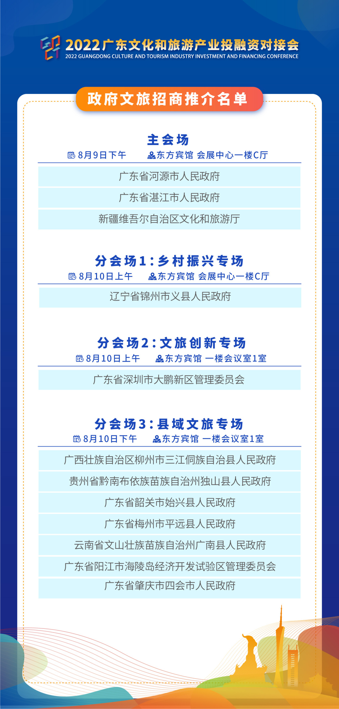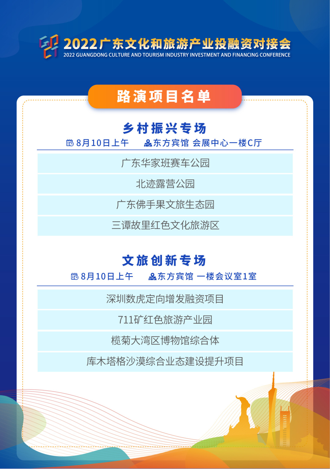 由广东省文化和旅游厅、广东省地方金融监督管理局主办,南方财经全媒体集团承办,广东省旅游协会投融资专业委员会、中国电信广东分公司协办的2022广东文化和旅游产业投融资对接会(以下简称“广东对接会”)将于8月9-10日在广州东方宾馆举办。