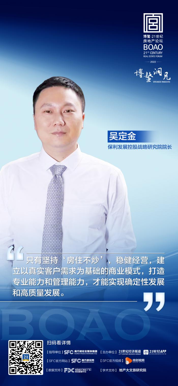 2022年7月29日,“博鳌·21世纪房地产论坛第22届年会”召开。本届论坛的主题为“风雨蜕变:良性循环下的模式重构”。在论坛上,保利发展控股战略研究院院长吴定金发表《坚持“房住不炒”,实现“确定性”发展》为题的演讲。