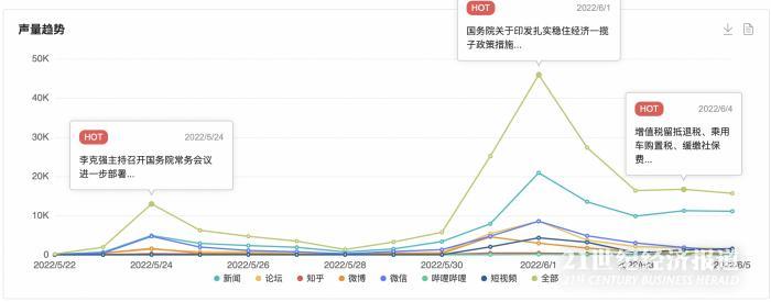 从传播趋势来看,“600亿元乘用车购置税减征”共出现两个讨论的高潮,第一个出现在5月24日,国常会发布了“阶段性减征部分乘用车购置税600亿元”的刺激汽车消费政策;第二个高峰是在6月1日,5月31日财政部、税务总局发布了600亿元购置税优惠政策的具体落实细则,6月1日,“6月1日至2022年12月31日期间内且单车价格(不含增值税)不超过30万元的2.0升及以下排量乘用车,减半征收车辆购置税”政策正式实施。
