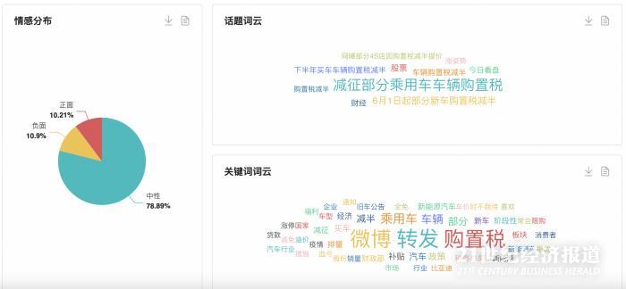 从热门话题的情感分布上来看,公众对“600亿元乘用车购置税减征”政策的整体态度以中性和正面情绪为主,关注的内容焦点和热门话题集中在“减征部分乘用车车辆购置税”“6月1日起部分新车购置税减半”等,通过微博热门评论分析发现,公众的评论热词为“乘用车”“购置税”“减半”等。