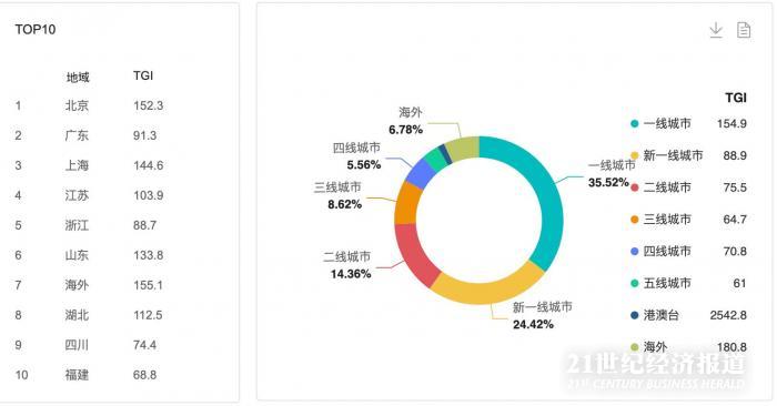 从关注人群的地域分布来看,北京市、广东省、上海市、江苏省、浙江省位居前五;从城市级别来看,一线、新一线城市占比接近60%。