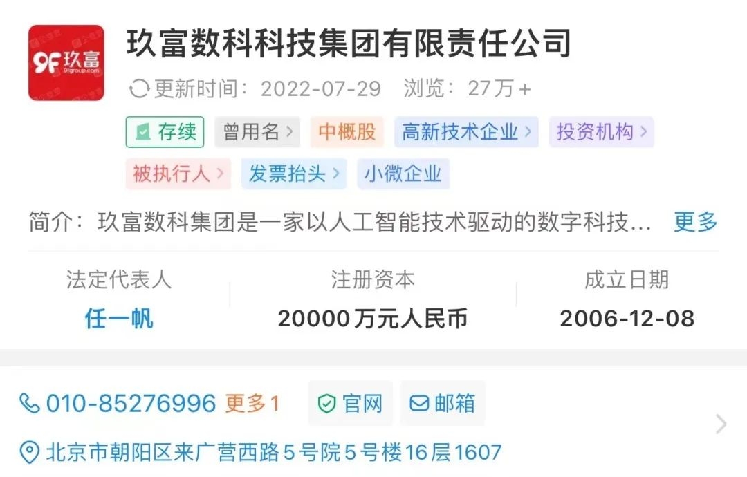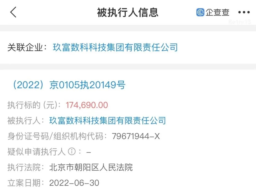 网友爆料中的“悟空理财”关联公司为玖富数科科技集团有限责任公司,成立于2006年,法定代表人为任一帆,注册资本为2亿元,曾于2019年纳斯达克上市。该集团旗下36家分支机构均已吊注销,但仍控股9家企业,间接持股40家企业。6月30日,该公司被北京市朝阳区人民法院列为被执行人,执行标的为17.47 万元,案由系劳动争议。
