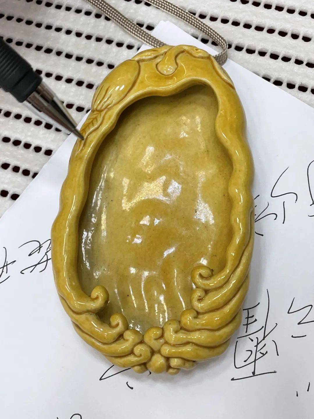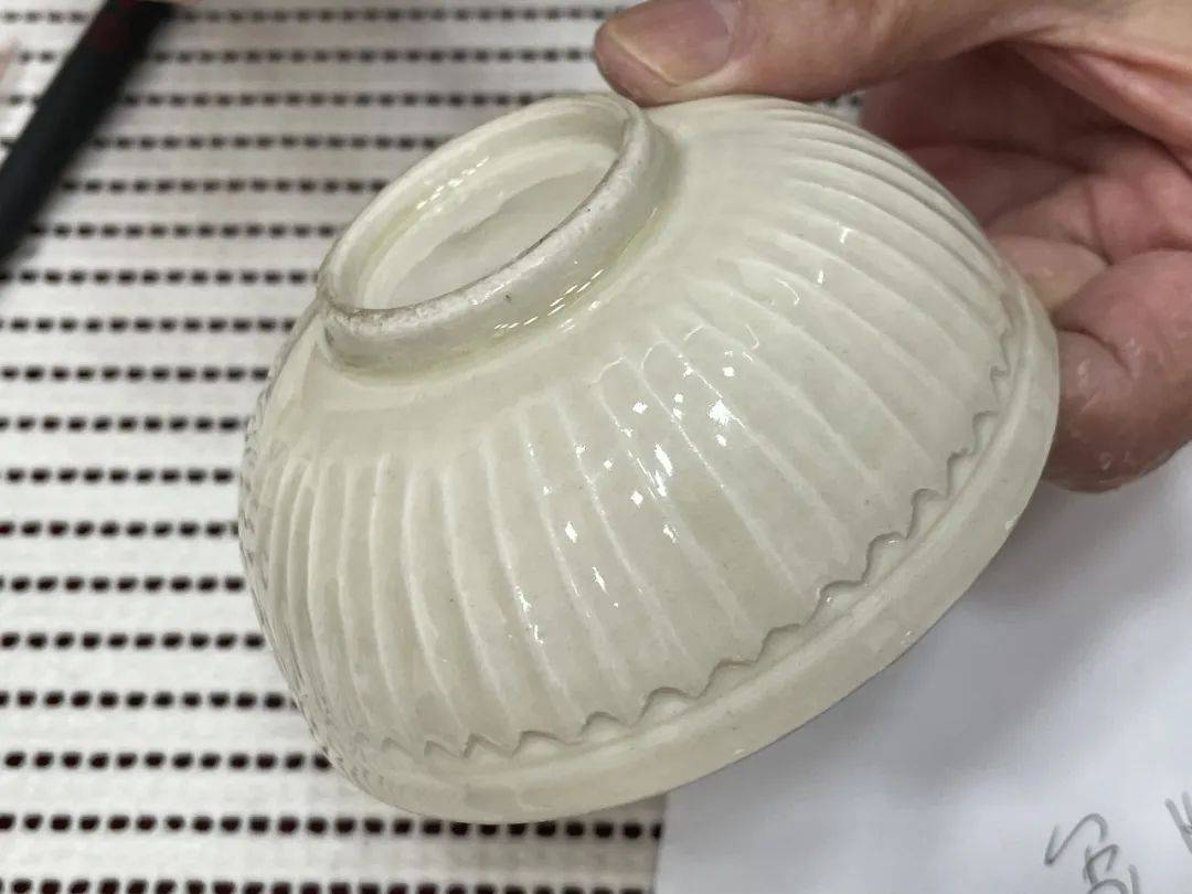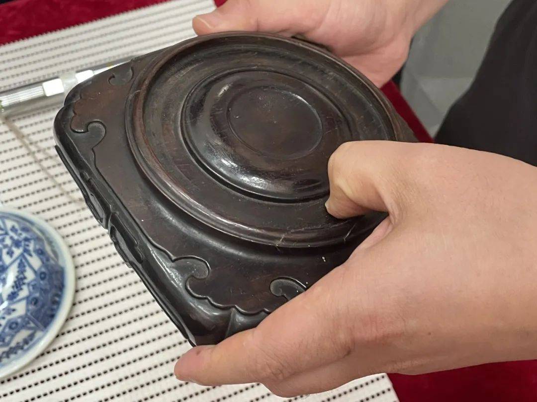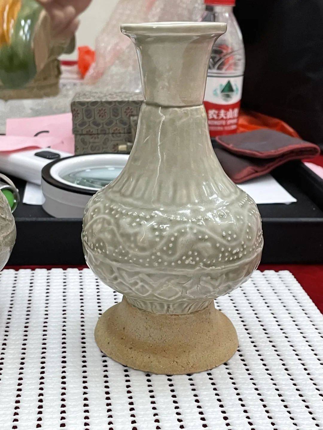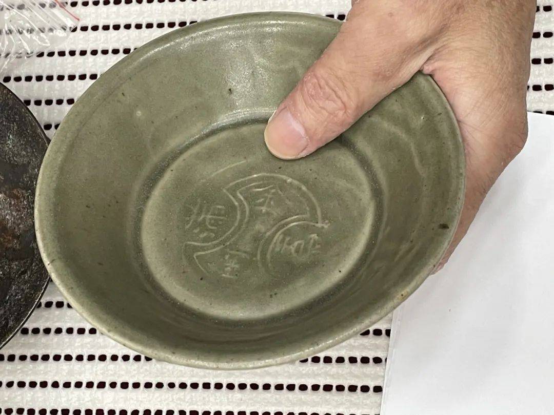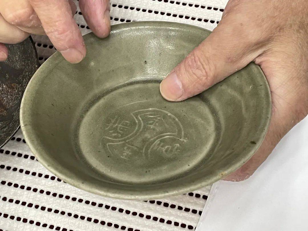 一位藏友带来了他收藏的一件青釉浅碗,印花是古代瓷器装饰方法之一,也是青瓷比较常见的工艺。西晋时已经出现,早期印花为带状印纹或局部印花,宋代多为通体印花。器物以盘、碗最为常见,一般采用陶模印制。常见印花花卉纹以菊花最为多见,荷花、荷叶、婴戏、海水鱼纹、海水螺纹也是经常采用的纹饰题材。这件青瓷浅碗造型圆润规整,釉色清雅沉静,盘心印“金玉满堂”字样,寓意吉祥,据两位专家推测,这件藏品的时期应该在明代中后期嘉靖万历年间,保存得比较完整,是一件青釉瓷中的佳作。