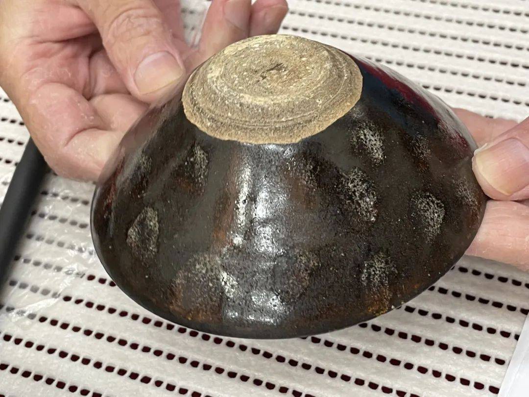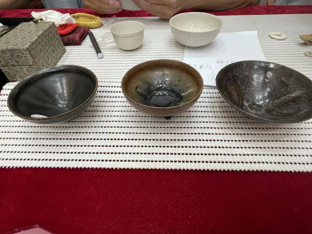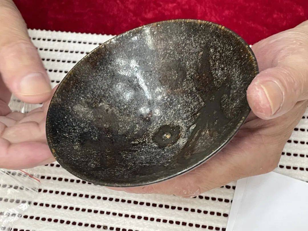 另一位藏友带来了他收藏的一批茶盏,其中这件鹧鸪斑纹茶盏最为引人注目。鹧鸪斑也是一种结晶釉。用含铁量不同的两种黑釉,在生坯上挂釉两次,以稍低于烧制其他结晶釉的温度焙烧,因较多的铁元素在釉里结晶,黑色釉面便呈现鹧鸪羽毛一样的花纹,故名鹧鸪斑。这件茶盏釉色腴润、纹饰疏朗,造型雅致,您也可在其中一窥宋代茶文化之美。