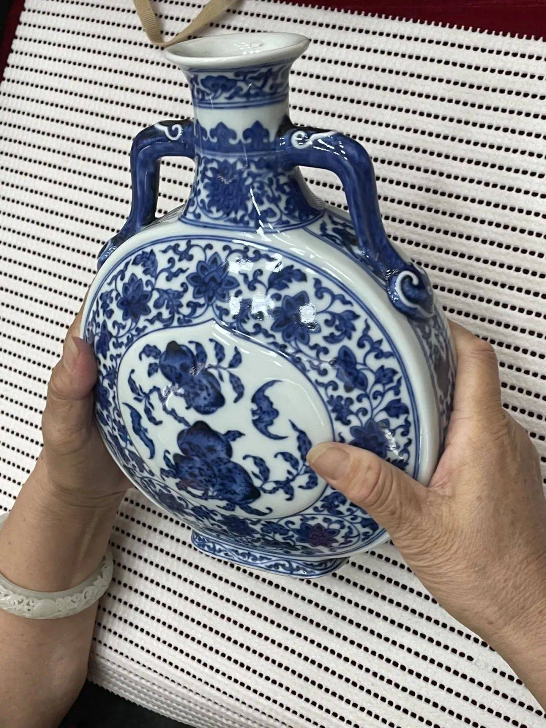这件藏品是一件清代乾隆时期的青花抱月瓶,抱月瓶因腹圆若满月而得名,又叫“福寿瓶”或“宝月瓶”。是受西亚文化影响而出现的器形,此瓶始见于明洪武时期,盛行于永乐、宣德时期,清雍正初仍有烧制,后因雍正帝不喜欢此类器物,曾下令“嗣后宝月瓶不必烧造”,故雍正后期少见,到清乾隆时又有烧制。