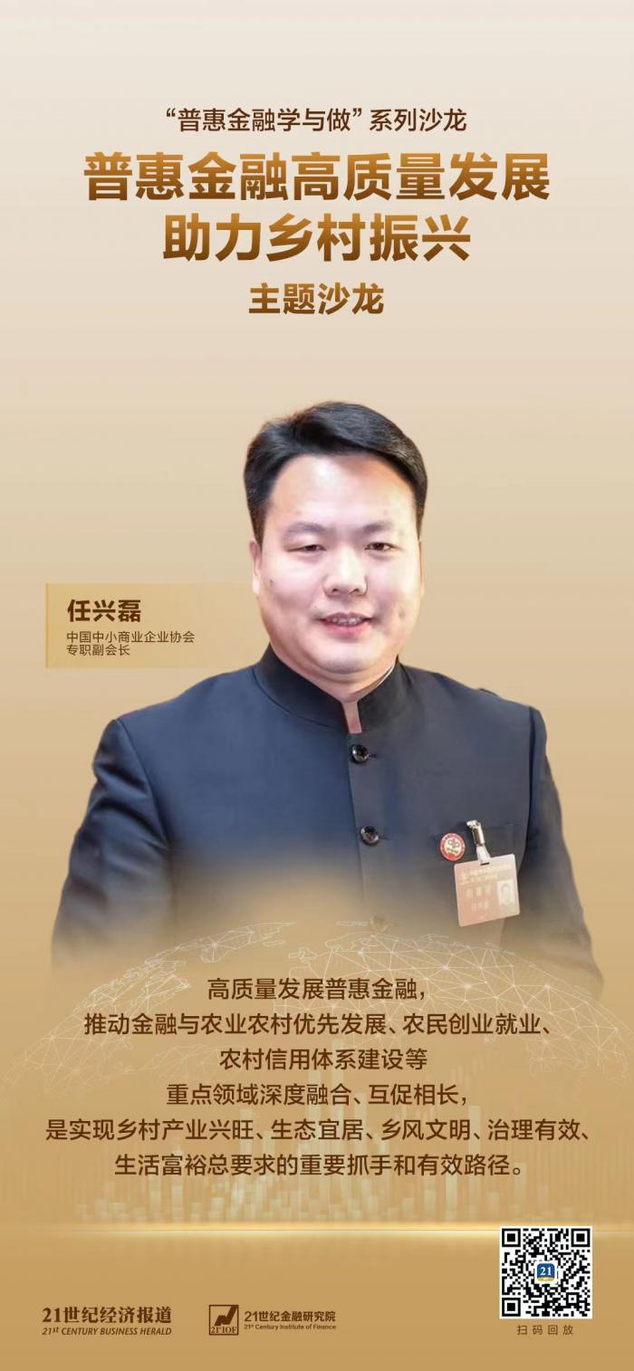 8月3日,21世纪金融研究院在京举办“普惠金融高质量发展,助力乡村振兴”主题沙龙。当天,中国中小商业企业协会常务副会长任兴磊出席沙龙并发表了主旨演讲。
