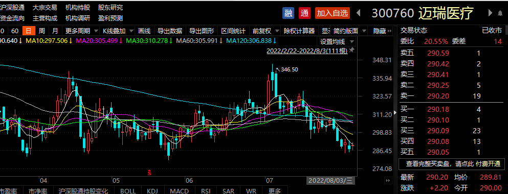 8月3日,迈瑞医疗收盘价为290.2元/股,当日股价微涨0.76%,总市值3519亿元。7月份,迈瑞医疗股价下跌7.57%。在2022年二季度末被434只基金持有,占流通股比例9.82%
